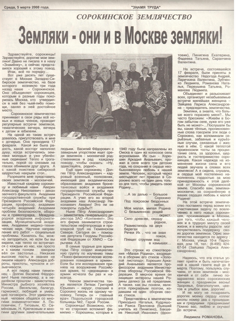Людмила Романова «Сорокинское землячество. Земляки – они и в Москве земляки!» Общественно-политическая газета «Знамя труда», 5 марта 2008г.