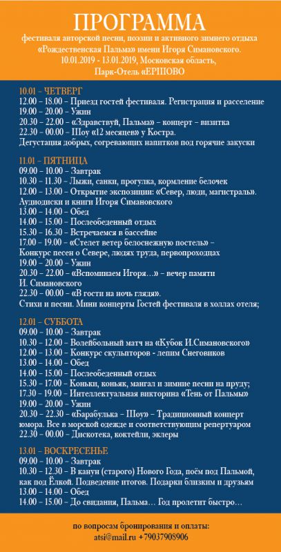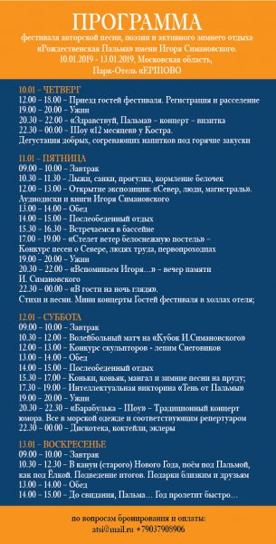 В программе фестиваля: открытие экспозиции «Север, люди, магистраль», «Стелет ветер белоснежную постель» – конкурс песен о Севере, людях труда, первопроходцах, «Вспоминаем Игоря…» – вечер памяти И. Симановского, «В гости, на ночь глядя» – стихи и песни, мини - концерты гостей фестиваля в холлах отеля, волейбольный матч на «Кубок И.Симановского», интеллектуальная викторина «Тень от Пальмы», «Барабулька – шоу» – традиционный концерт юмора, все в морской одежде и с соответствующим репертуаром. Конечно, аудиодиски и книги Игоря Симановского. А также шоу «12 месяцев» в лесу у костра, лыжи, коньки, санки, прогулки, кормление белочек, конкурс скульпторов – лепим снеговиков, мангал, дегустации и зимние песни на пруду, бассейн, дискотека, коктейли, эклеры и добрые друзья. В канун Старого Нового года поём под пальмой, как под ёлкой. Подведение итогов. Подарки близким и друзьям.