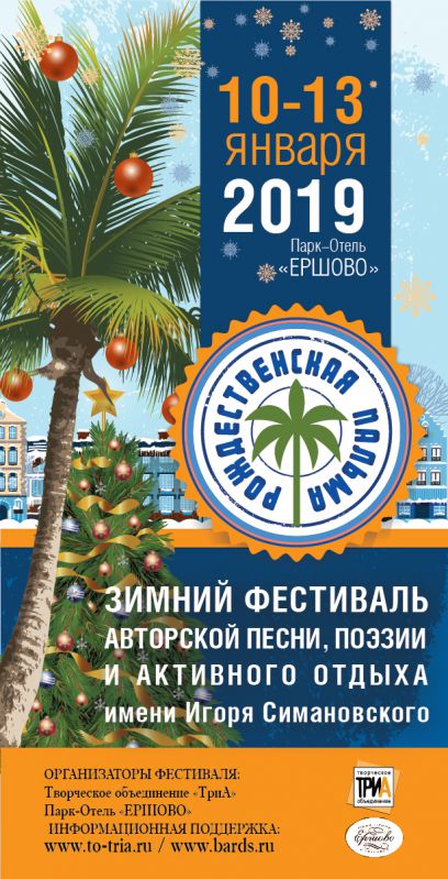 К участию в зимнем фестивале «Рождественская Пальма» приглашают самодеятельных авторов, композиторов, исполнителей, ансамбли, поэтов и слушателей, изъявивших желание совместного организованного времяпровождения в компании друзей Игоря Симановского, десятков прекрасных поэтов и бардов, знающих его творчество. Справки по тел.: +7 (903) 790-89-06 (Александр Цилькер).