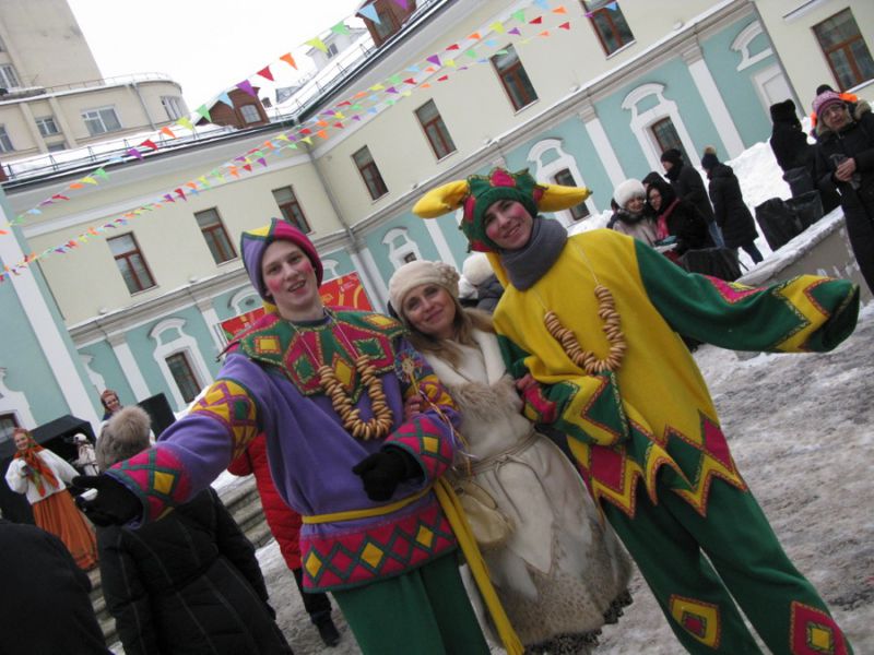 В Московском доме национальностей гостей праздничных гуляний встречали два скомороха–коробейника в ярких костюмах со связками баранок на шее.
