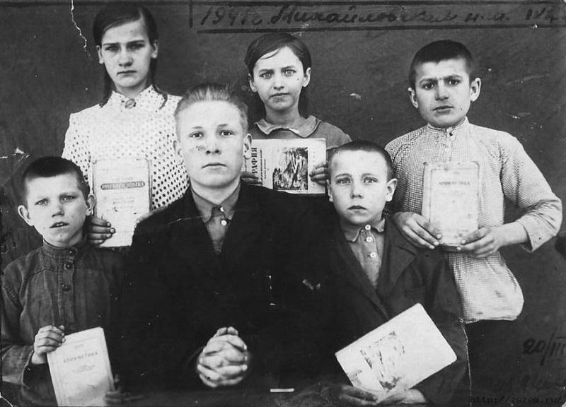 | Со школьным учителем. Михайловка, 1941г. Справа, в нижнем ряду – Коля Сизов. |