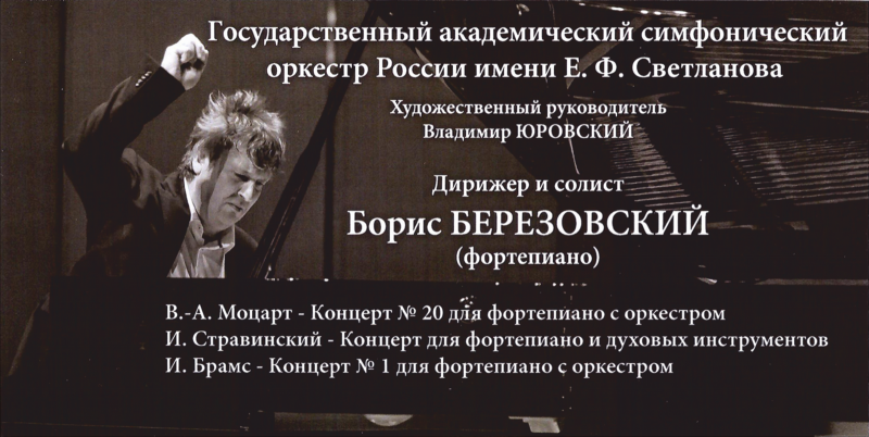 Приглашаем Вас на концерт государственного академического симфонического оркестра России им. Е.Ф.Светланова (художественный руководитель Владимир Юровский, дирижер и солист Борис Березовский (фортепиано)), который состоится 7 апреля 2017г., в 18.00 в Доме культуры Национального исследовательского технологического университета «МИСиС» (метро Октябрьская кольцевая, Ленинский проспект, дом 4).