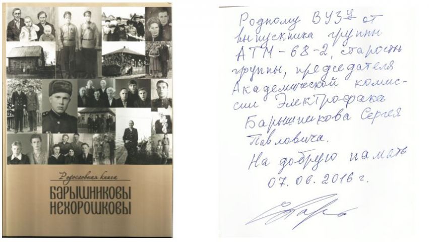 Автограф С.П.Барышникова на Родословной Книге, подаренной вузу |