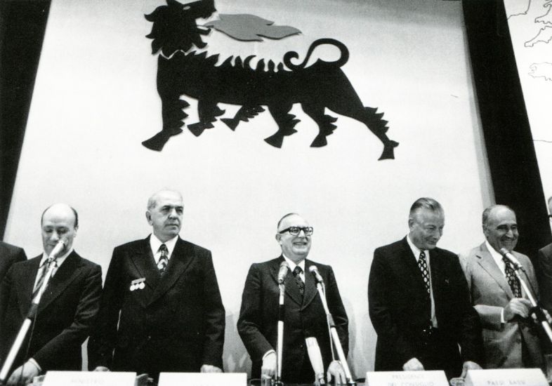 У микрофона премьер-министр Италии Альдо Моро. Слева от него – Сабит Оруджев