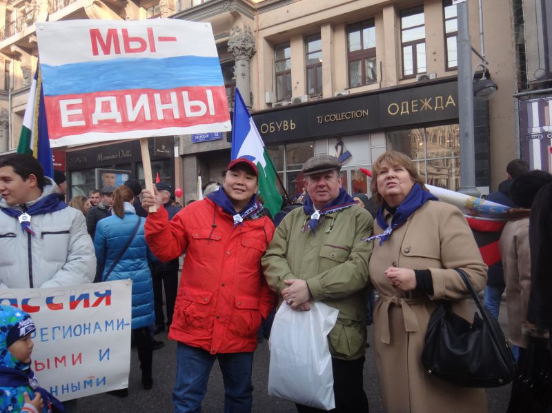 В этой замечательной прогулке по центральной улице столицы мы с Наталией Косминской оказалась в классной компании дружных, веселых сотрудников и их детей представительств правительств Ямало – Ненецкого автономного округа и Тюменской области и их молодых руководителей. Мы с удовольствием пропустили вперед колонну «Трезвая Россия»: они обязаны быть впереди. Яркое солнце, веселая музыка, голос диктора, развивающиеся флаги, улыбки и смех вокруг… Кстати, флаги Ямала на телескопических удочках реяли выше всех стягов. А их было неисчислимое количество.