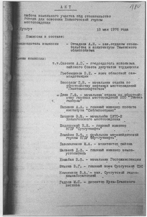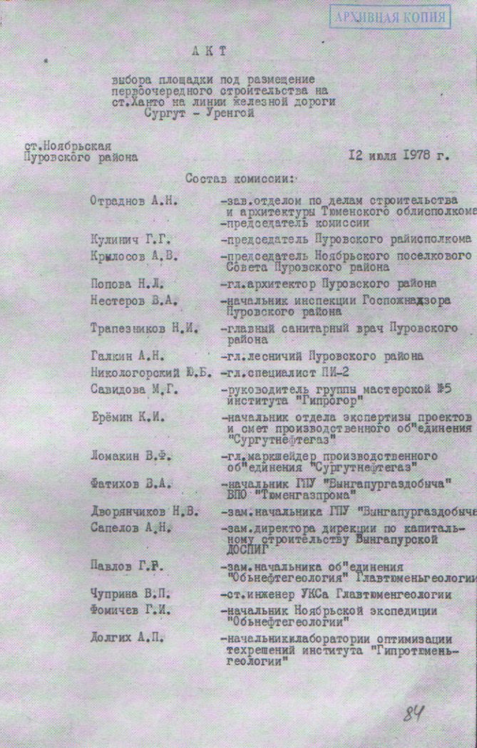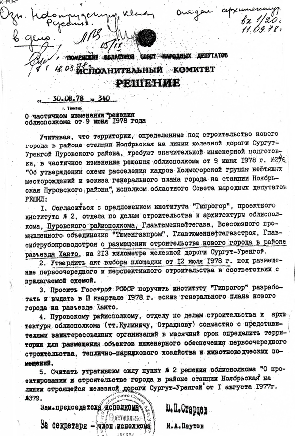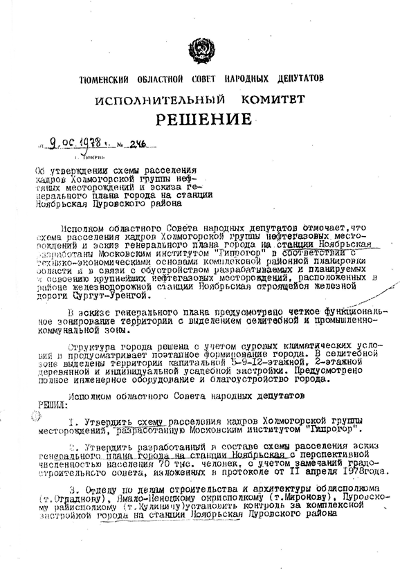 Несмотря на это предложение, Тюменский облисполком в 1977 году согласовал Акт выбора площадки, а Решением № 246 от 09.06.1978 г. утвердил схему генерального плана под город Ноябрьск на выбранной территории.