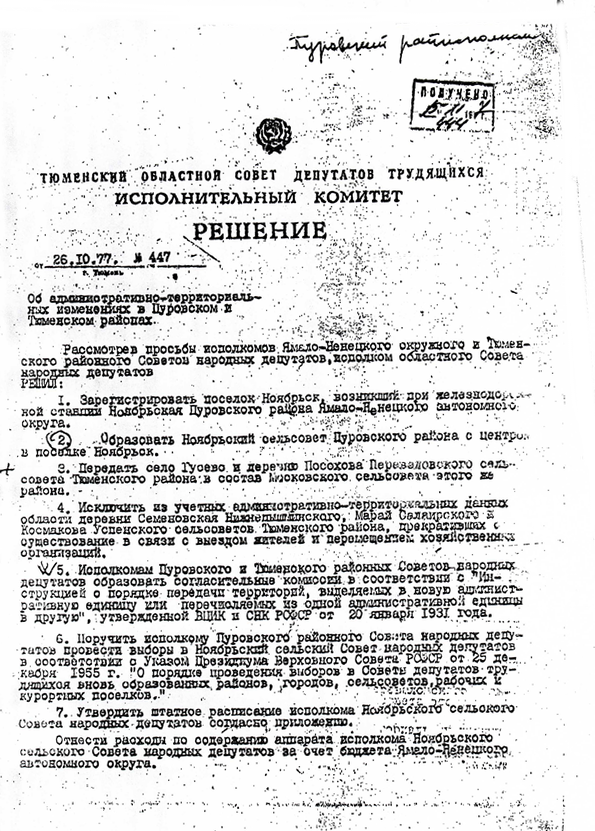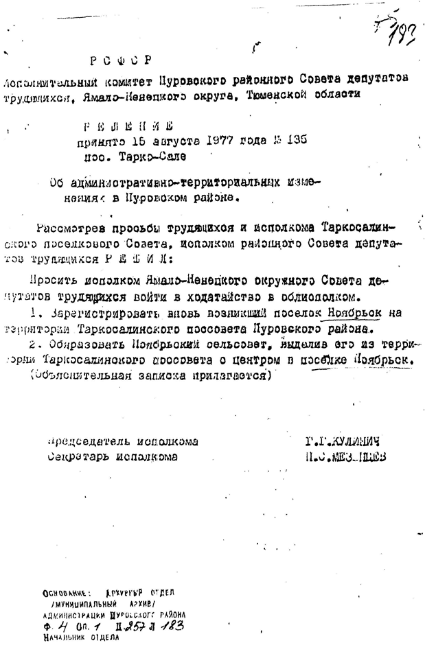 Необходимо отметить, что и по посёлок Ноябрьск появился на озере Хан-То не так просто. Пуровскому райисполкому пришлось добиваться того, чтобы будущий город Ноябрьск оказался в Пуровском районе и на благоприятной местности для проживания. Сначала обслуживание нового посёлка было поручено Таркосалинскому поселковому Совету. Затем Пуровский райисполком выделил этот новый посёлок из Тарко-Салинского поселкового Совета и вышел с просьбой перед Тюменским облисполкомом зарегистрировать его под названием «Ноябрьск». Тюменский облисполком утвердил это решение. Так появился посёлок Ноябрьск при станции «Ноябрьская», станция - это отдельный населённый пункт. (Решение Пуровского райисполкома № 135 от 15.08.1977 г., Решение Тюменского облисполкома № 447 от 26.10.1977 г.)