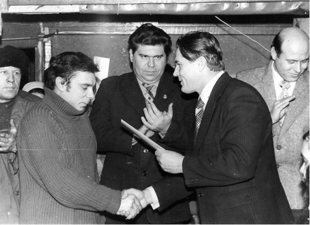 Вручение буровому мастеру Таркосалинской нефтеразведочной экспедиции В.А.Исаеву Почётной грамоты Министра геологии РСФСР. Слева направо: рабочий бригады, В.А.Исаев, начальник Таркосалинской экспедиции А.И.Шапошников, первый секретарь Пуровского райкома КПСС А.М.Анисимов, секретарь парткома экспедиции Ю.П.Вилков |