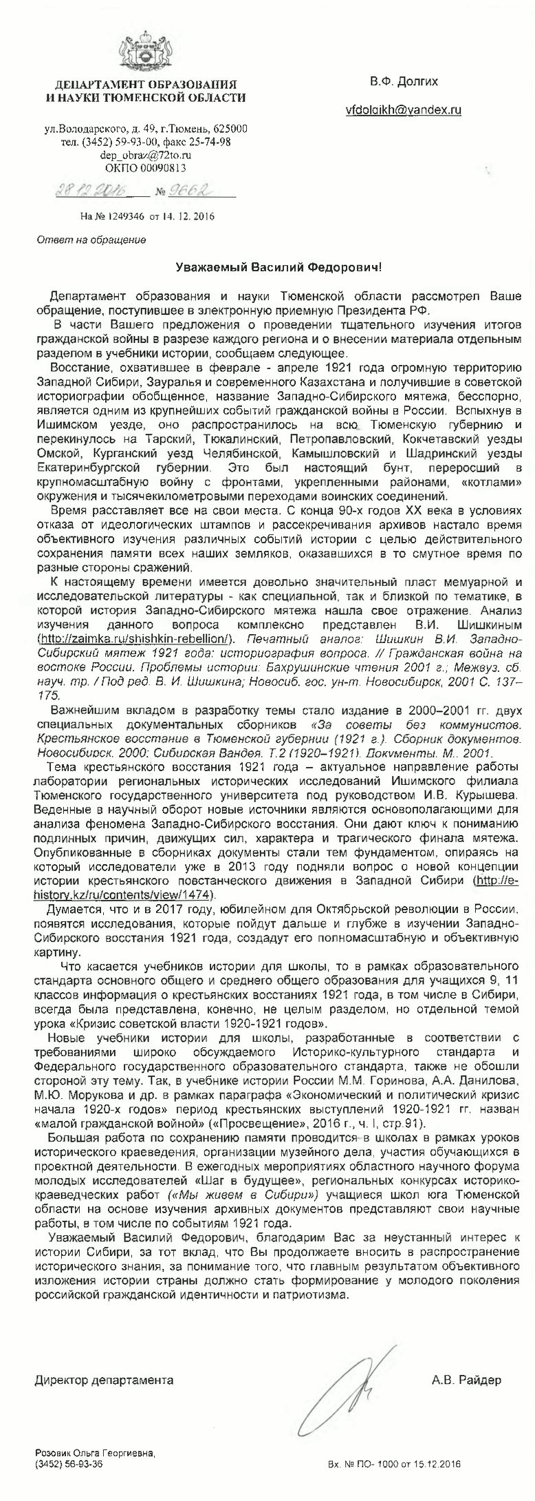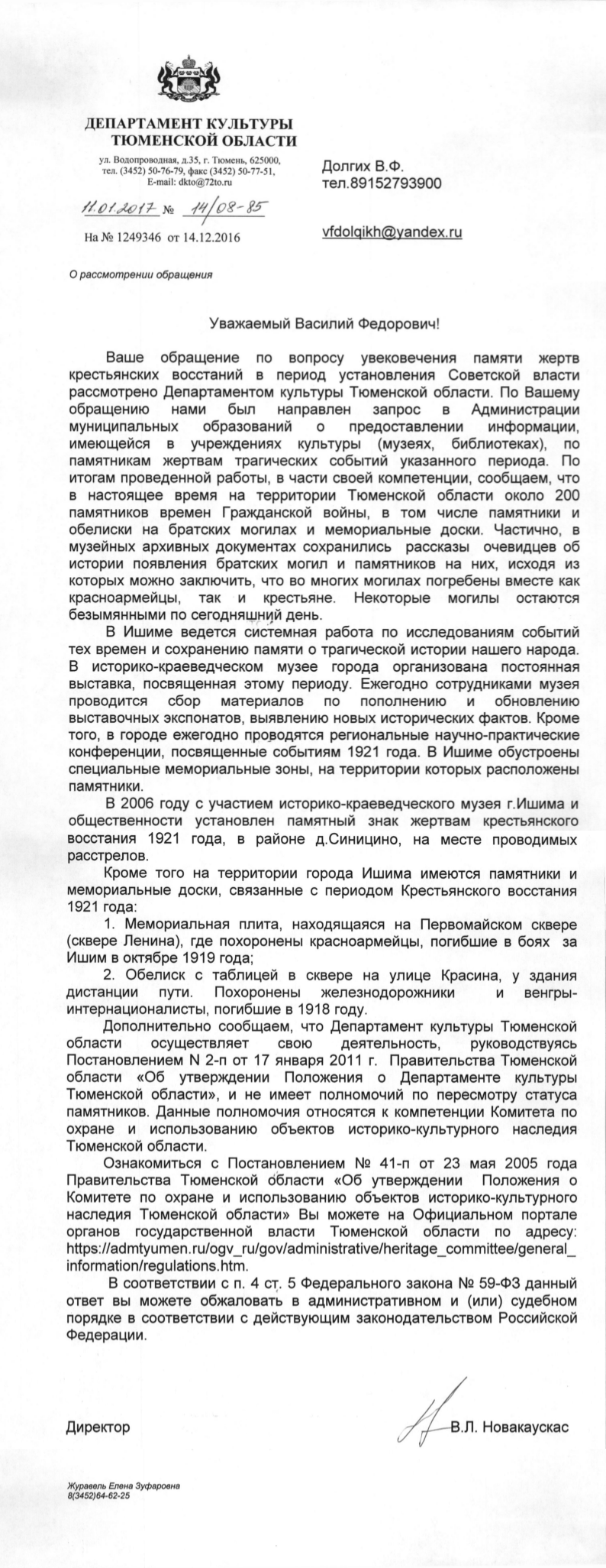 В декабре 2016 года на страницах нашего портала началась дискуссия, посвященная вопросам возрождения исторической памяти. Ее инициатор – член Западно-Сибирского землячества Василий Долгих обратился с рядом предложений к Президенту России Владимиру Путину. Предлагаем Вам ознакомиться с ответами на письмо, недавно поступившими по поручению Приемной Президента из Департамента образования и науки и Департамента культуры Тюменской области.