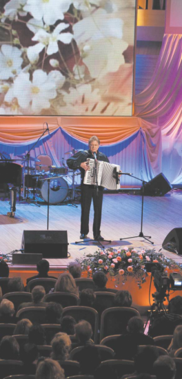 Гастролирует по России, выступает в филармонических залах и особым спросом пользуются его концерты, где певец поет, сам себе, аккомпанируя на аккордеоне, которым блестяще владеет.