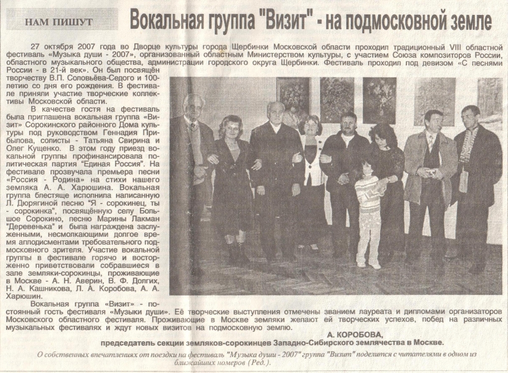 Лариса Коробова, председатель секции земляков-сорокинцев Западно-Сибирского землячества в Москве «Вокальная группа «Визит» - на подмосковной земле».