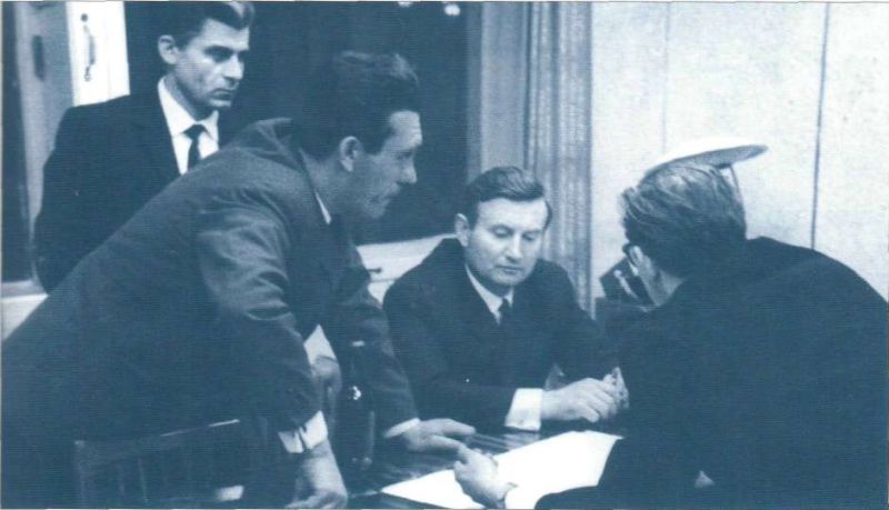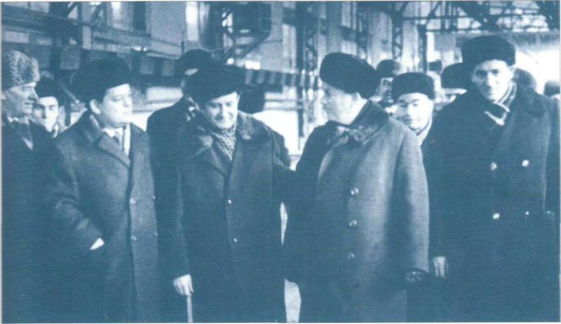 Первый секретарь Тюменского обкома КПСС Б. Е. Щербина, заместитель министра газовой промышленности СССР Ю. П. Баталин, заместитель Председателя Совета Министров СССР В. Э.Дымшиц, началъник Главтюменнефтегазстроя Е.А. Огородное и председатель Тюменского облисполкома Л. Н. Кузнецов во время посещения Завода блочно-комплектных устройств (БКУ). Тюмень, 1971 г. |