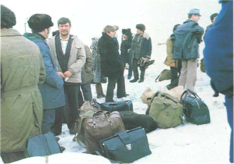 1984 год. Грунтовой аэропорт Харасавея. Вахтовики в ожидании самолета с «большой земли» |