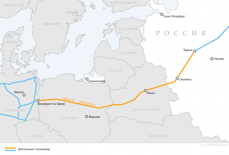 Начались коммерческие поставки газа по газопроводу «Ямал — Европа», построенному по территории России, Беларуси, Польши и Германии.