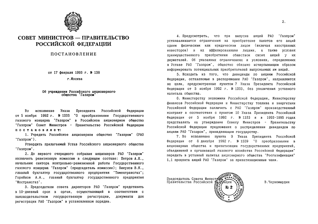 Постановлением Правительства РФ во исполнение Указа Президента РФ Государственный газовый концерн «Газпром» преобразован в Российское акционерное общество.