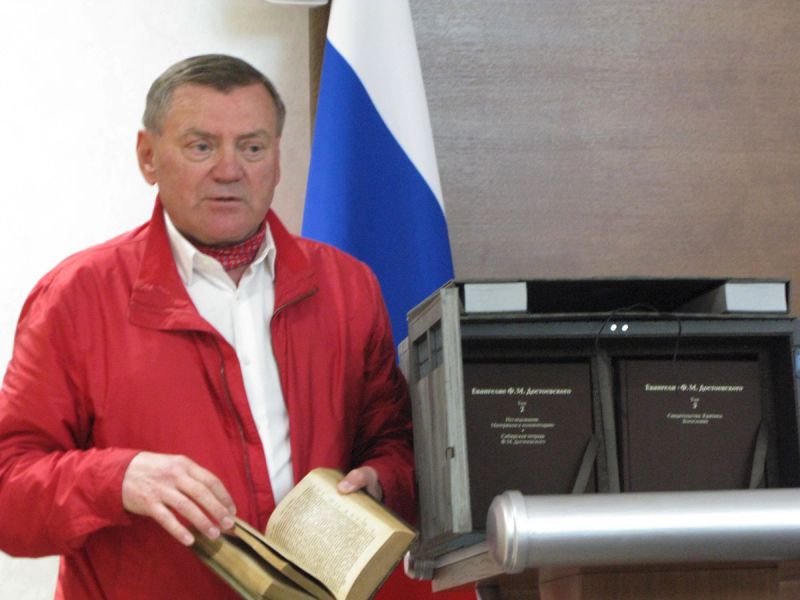 Президент Благотворительного Фонда «Возрождение Тобольска» Аркадий Елфимов представил землякам уникальный проект – Евангелие Фёдора Михайловича Достоевского, рассказал об истории его зарождения и трудной работе по воплощению задумки в жизнь.