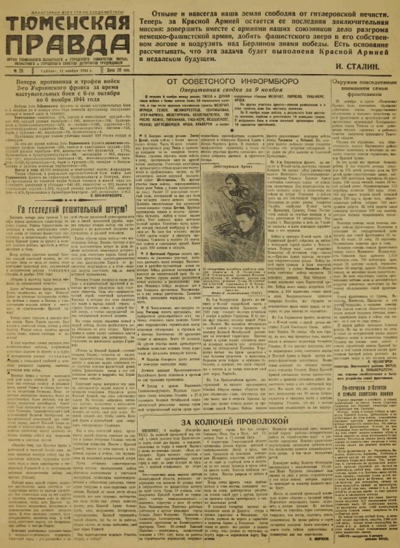Первый номер газеты «Тюменская правда» вышел в свет 1 октября 1944 г.
