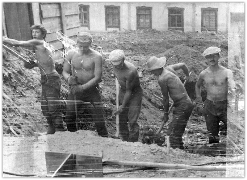 Бойцы ССО «Романтик» строят теплотрассу – колодец, в центре – Сергей Коновалов. Золотоизвлекательная фабрика «Рудника им. А.Матросова», п.Омчак Магаданской области, 1972г. |