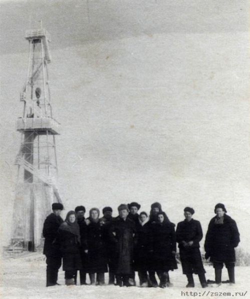 Главный геолог Лев Ровнин (в центре) в Березово на фоне вышки – первооткрывательницы. 21 сентября 1953г. скважина Р-1 известила мир о несметных богатствах Тюменских недр.