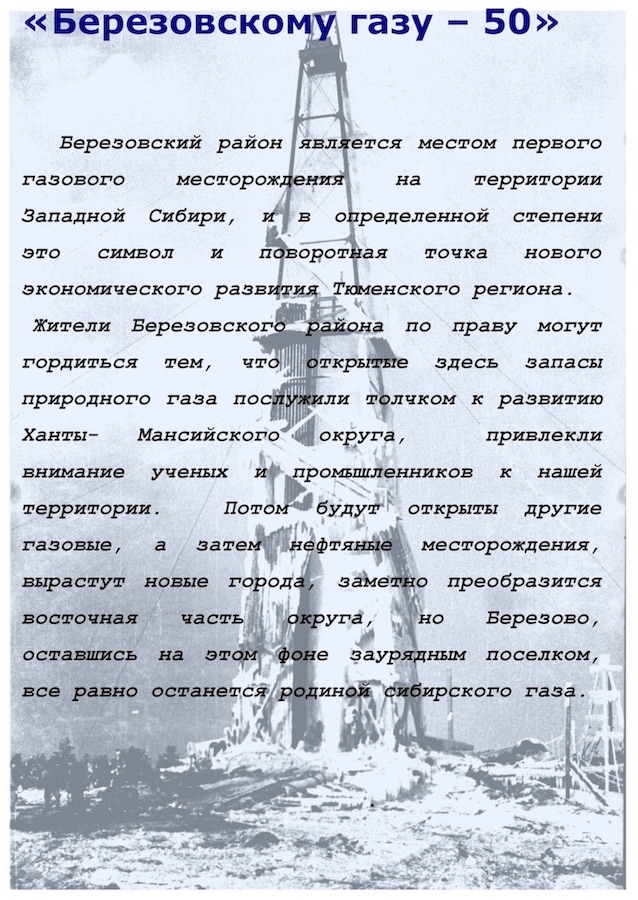 В дни 65-летнего юбилея приглашаем наших читателей, дорогих земляков перелистать памятную брошюру Березовского историко-краеведческого музея, посвященную открытию первого в Сибири газового месторождения (составитель Л. Андриянова, 2004г.).
