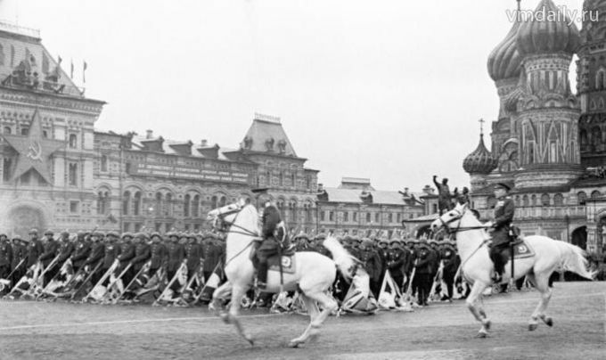 Министр обороны России Сергей Кужугетович Шойгу, выезжая из ворот Спасской башни Кремля, снимает фуражку и осеняет себя Крестным знамением. Так начинается грандиозный военный парад, посвященный празднованию Великой Победы. И глядя на этот парад, невозможно не вспомнить два великих парада, которые проходили на Красной площади. Парад 7 ноября 1941 г., когда враг стоял у стен Москвы, и Т-34 и батальоны прямо с Красной площади уходили в бой. И великий парад Победы на праздник Троицы 24 июня 45-го, когда принимая парад, Георгий Константинович Жуков, также, выезжая из ворот Спасской башни, снял фуражку.