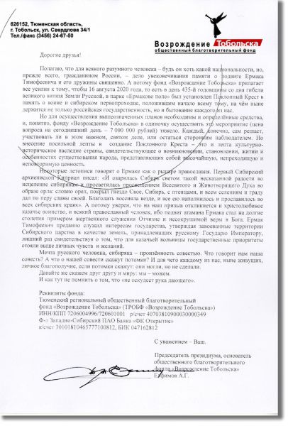 «Каждый, конечно, сам решает, участвовать ли в этом важном, святом деле, или остаться сторонним наблюдателем. Но внесение посильной лепты в создание Поклонного Креста – это и лепта в культурно-историческое наследие страны, свидетельствующее о возникновении, становлении, житии и особенностях существования народа, представляющих собой высочайшую, непреходящую и неповторимую ценность», – говорится в обращении с приложенными реквизитами общественного благотворительного фонда «Возрождение Тобольска».