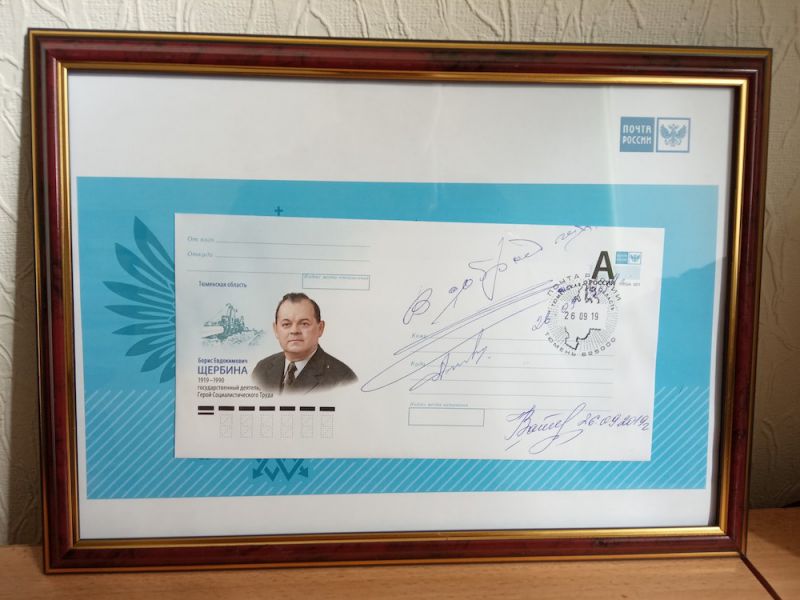В ходе презентации произошло знаменательное событие: гашение почтовых конвертов, посвященных 100-летию Б.Е. Щербины. Маркированный конверт выпущен общим тиражом 250 тысяч экземпляров. На конверте размещен его портрет и надпись: «Тюменская область. Борис Евдокимович Щербина 1919–1990, государственный деятель, Герой Социалистического Труда».