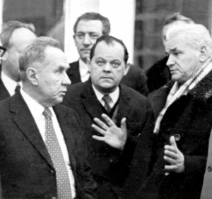 | Председатель Совета Министров СССР Алексей Косыгин, первый секретарь Тюменского обкома КПСС Борис Щербина и министр энергетики и электрификации Петр Непорожний. Сургутская ГРЭС, январь 1968г. |