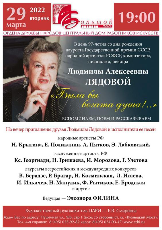 Людмила Алексеевна Лядова уже 80 лет на сцене. Ее песни исполняли выдающиеся артисты нашей страны и мира: Ван Клиберн и Елена Образцова, Надежда Обухова, Клавдия Ивановна Шульженко и Иосиф Кобзон, Валентина Толкунова, Лев Лещенко, Эдита Пьеха... В советское время ее песенная мозаика была не просто востребована, а необходима. Композитор отзывался на все важнейшие события в стране, воспевая людей труда и подвига: шахтеров и летчиков, геологов, воинов - тех, кто умел по-настоящему работать, хорошо делать свое дело во имя Родины! Ее называют "Патриот №1"! С ее болью и любовью за русскую землю и ее народ, она не может быть безучастной, а ее активная жизненная позиция, огромный профессиональный и человеческий опыт не оставляют равнодушными ее зрителей, которые заполняют концертные залы…