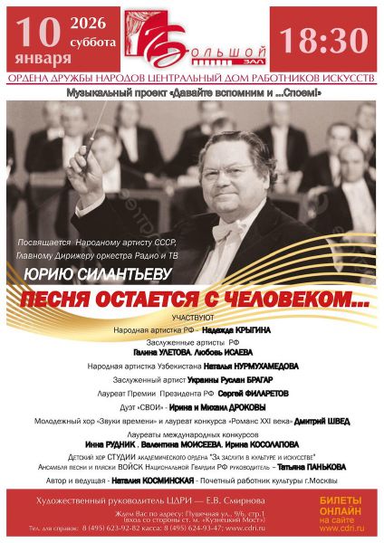 10 января состоится концерт «Песня остается с человеком», посвященный памяти народного артиста СССР, главного дирижера оркестра радио и телевидения Юрия Силантьева. Автор и ведущая - почетный работник культуры г. Москвы Наталия Косминская. В концерте примут участие популярные артисты и творческие коллективы.