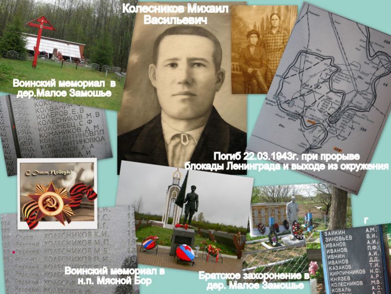 Теперь, после долгих и мучительных поисков о судьбе отца я знаю почти всё. Отец погиб 22 марта 1942 года на Волховском фронте (52 армия, 305СД, 1004СП) при прорыве блокады Ленинграда и выходе из окружения по направлению на н.п.Мясной Бор. Похоронен в братском захоронении в деревне Малое Замошье Новгородской области. Имя отца записано на мраморных досках мемориалов М.Замошье, Мясной Бор и на родине - в селе Фоминское.
