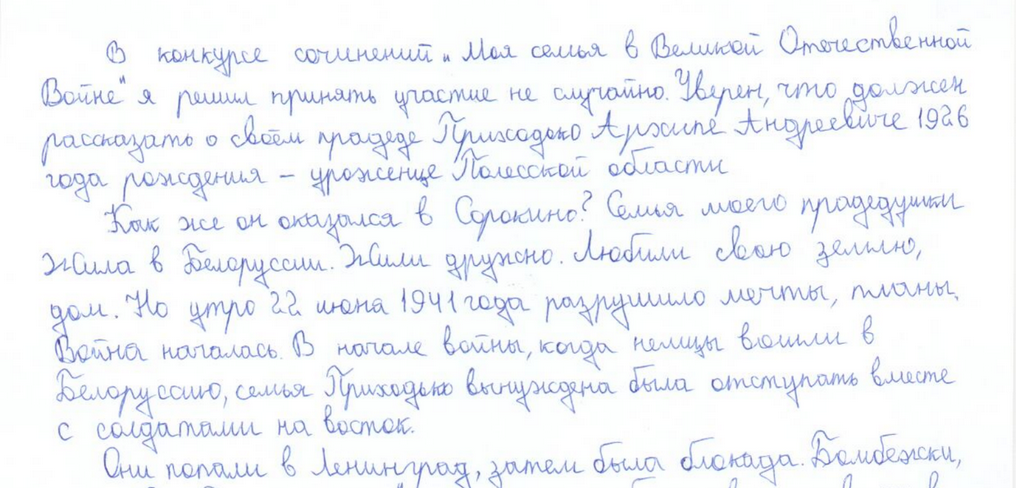 В конкурсе сочинений «Моя семья в Великой Отечественной войне» я решил принять участие не случайно. Уверен, что должен рассказать о своем прадеде Приходько Архипе Андреевиче 1926 года рождения – уроженце Полесской области.