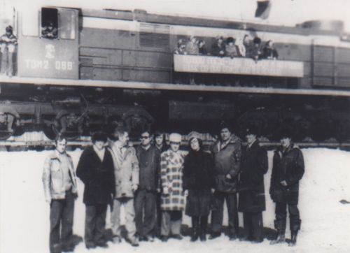 Прибытие первого поезда в Тарко-Сале по строящейся железной дороге Сургут-Уренгой. Заместитель Главы Администрации Пуровского района Юрий Павлович Вилков в цветном пальто