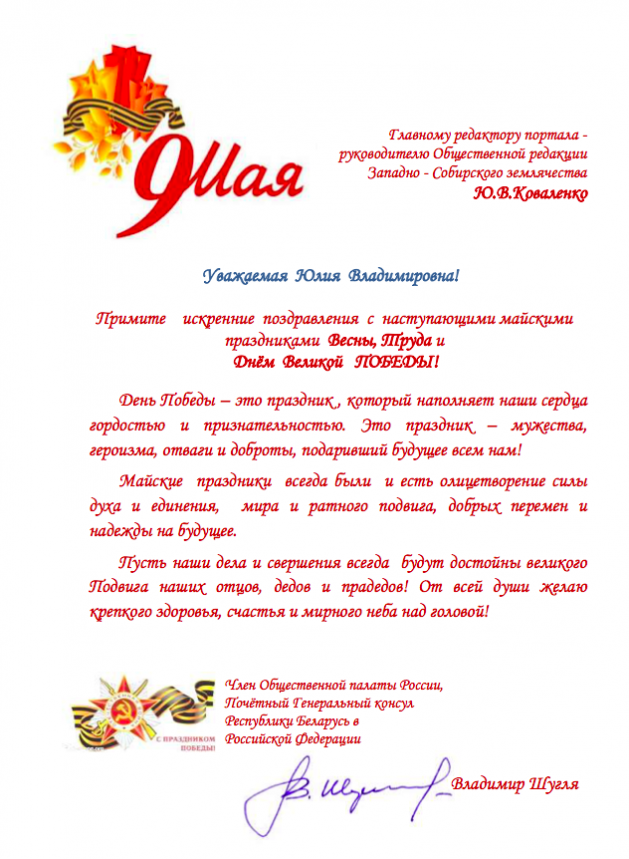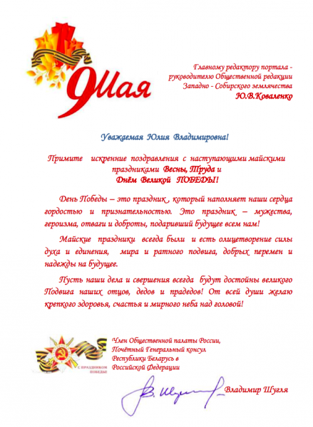 Владимир Шугля: Пусть наши дела и свершения всегда будут достойны великого Подвига наших отцов, дедов и прадедов!