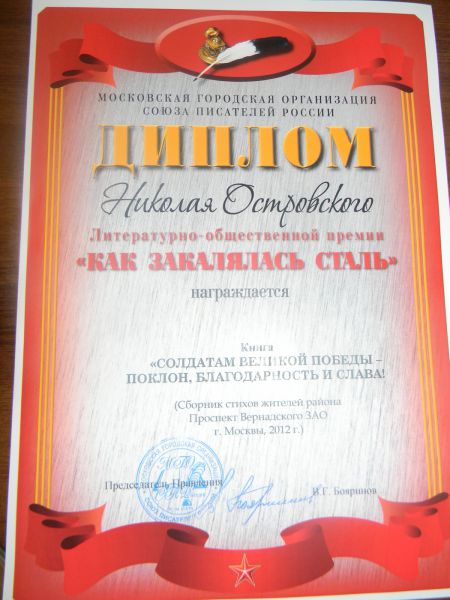 От имени ветеранов района Проспект Вернадского и представителей молодого поколения вручила Владимиру Ивановичу книги, которые мы выпускаем в районе при поддержке, инициативе главы управы В.В.Урванова и Совета ветеранов войны и труда, возглавляемого Т.П.Беловой (наше землячество взаимодействует с ними). В настоящее время трудимся над двумя книгами второго тома под названием «Солдатам Великой Победы – поклон, благодарность и слава!»