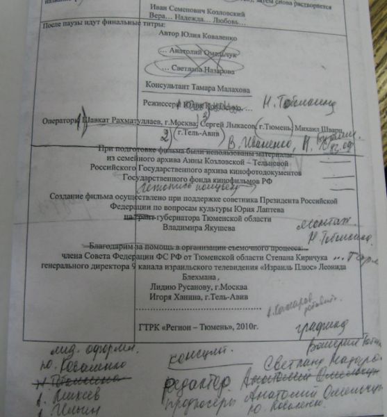 | Титры в сценарии Ю. Коваленко поправила своей рукой Н. Тоболкина. В графе "режиссер" она зачеркнула имя автора фильма и вписала свое |