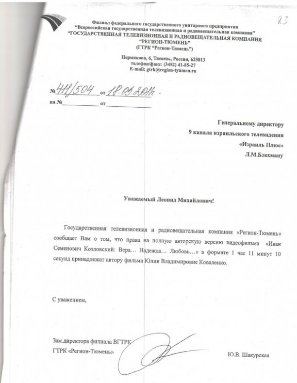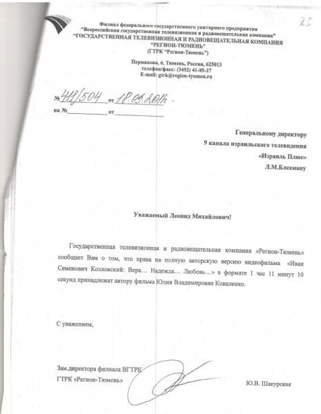 «Над фильмом я работала более 17 лет. Он создан в соавторстве с Тамарой Денисовной Малаховой, помощником Ивана Семеновича Козловского, которая собирала сведения и материалы, вошедшие в фильм, более 25 лет. В создании картины нам помогали родные и близкие легендарного артиста, его коллеги. Потребовались сотни встреч, уточнений, согласований… Мы совместно добивались разрешения использовать в фильме кадры из личных архивов. Чтобы взять интервью у коллег героя фильма – сестер Михоэлс, я ездила в Израиль. За свой счет. Никаких творческих и финансовых вложений в сбор сведений, использованных в фильме, сотрудники «Регион-Тюмени» не внесли. Более того, в отчет об использовании средств правительства Тюменской области включили сведения о несуществующих расходах. Они всего лишь в течение 5 дней отсняли подготовленных мной участников фильма (в Москве в 2010г.) и за 18 дней смонтировали картину из предоставленного нами материала и по написанному мною сценарию под моим личным руководством». (Предварительно мной были созданы синопсис (идея, по которой получен грант губернатора), сценарная заявка фильма, отобраны его участники, проведены с ними прединтервью для включения в общую концепцию фильма перед его съемками, сами места съемок, необходимый для создания фильма кино- , аудио, печатный, фото- и эпистолярный архив. Организован съемочный график и непосредственное руководство съемочным процессом. - Осуществлен весь комплекс режиссерско-постановочной работы по созданию фильма до начала и в период его производства.) Ведь фильм снимался в разные годы в различных городах и странах», — рассказывает Юлия Коваленко. Она считает, что сотрудницу телекомпании «Регион-Тюмень» Нэлли Тоболкину в титрах нужно было указать как режиссера монтажа, а не режиссером-постановщиком. С позицией Коваленко согласны и те, кто лично знал героя фильма – Ивана Семеновича Козловского и лично помогал Юлии Владимировне собирать материалы для создания картины. Под письмом президенту подписались более 20 человек, все – народные и заслуженные артисты…