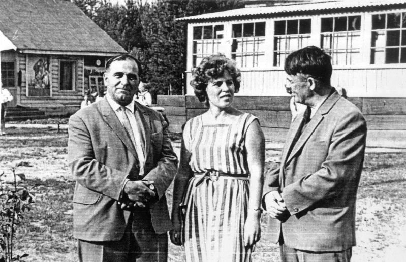 | Слева направо: П.К.Худолеев – заведующий облоно; В.Н.Кубочкина, инспектор школ облоно; А.М.Андрианов - председатель областного совета профсоюзов. |