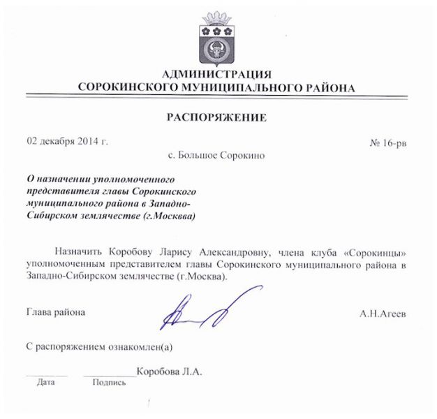 P.S. от общественной редакции портала: пока версталась статья, глава администрации Сорокинского муниципального района А.Н.Агеев подписал распоряжение о назначении руководителя клуба «Сорокинцы» Л.А.Коробовой своим уполномоченным представителем в РОО «Западно – Сибирское землячество» в г.Москве. Поздравляем землячку!