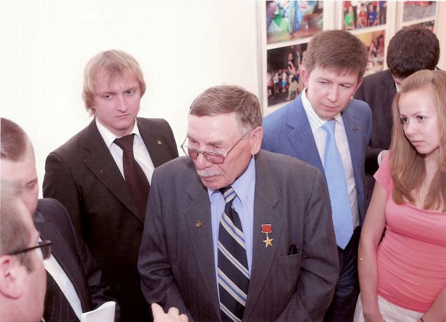 У стенда музея с экспонатами Г.К.Петрова, 2002г. |