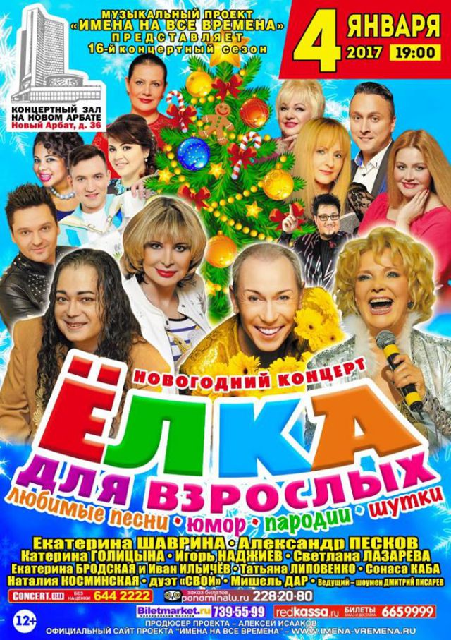 В самом центре Москвы, на «Ёлке для взрослых», – любимые артисты, музыканты и юмористы, хиты прошлых лет и сегодняшнего дня, зажигательные танцы, песни под баян, неожиданные сюрпризы, конкурсы для зрителей, шампанское для победителей. Не обойдётся и без традиционного участия деда Мороза и Снегурочки.
