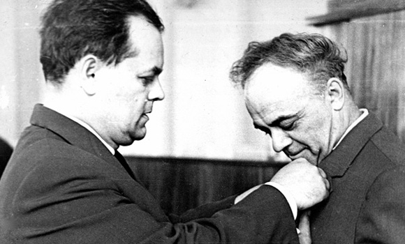 Б.Е.Щербина прикрепляет В.И.Муравленко