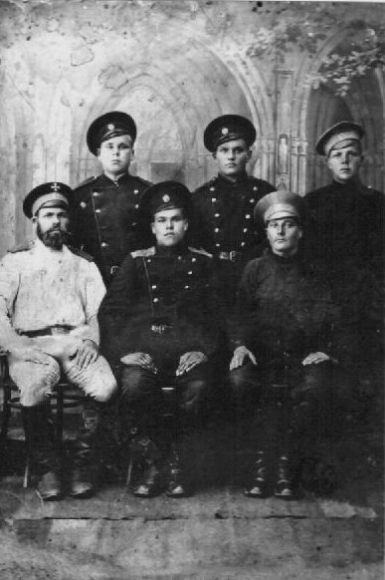Слево направо:  сидят Илларион Павлович и Николай Павлович Стрельцовы, 1916 год