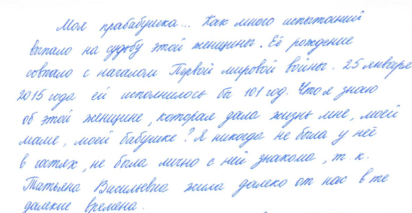 Моя прабабушка… Как много испытаний выпало на судьбу этой женщины. Ее рождение совпало с началом Первой мировой войны. 25 января 2015 года ей исполнился бы 101 год. Что я знаю об этой женщине, которая дала жизнь мне, моей маме, моей бабушке? Я никогда не была у нее в гостях, не была лично с ней знакома, так как Татьяна Васильевна жила далеко от нас в те далекие времена.