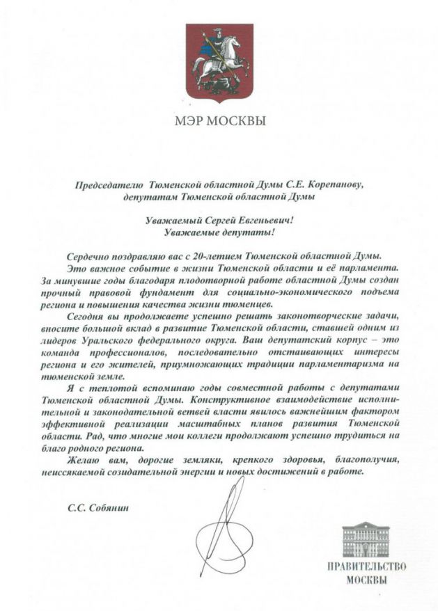 Мэр Москвы С.Собянин: "Я с теплотой вспоминаю годы совместной работы с депутатами Тюменской областной Думы"