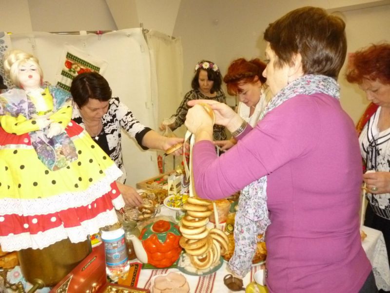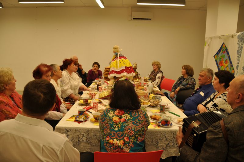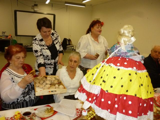 И вновь мы собрались в уютном зале библиотеки №129 на  Братиславской. Для проведения мероприятия, которое организовала Раиса Павловна Кудряшова, участники принесли реквизит для воссоздания  дружеской домашней обстановки: большой медный самовар с куклой наверху, красивый заварной чайник, бублики, пряники, торты, пирожное, печенье, мед, варенье, пироги с яблоками, пиццу и многое другое.
