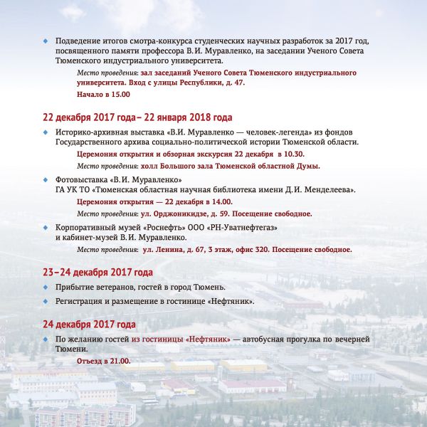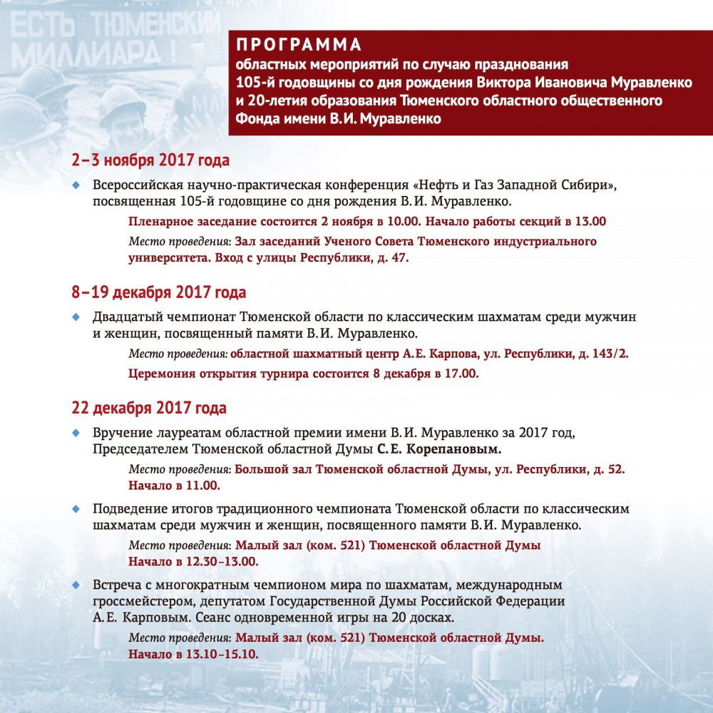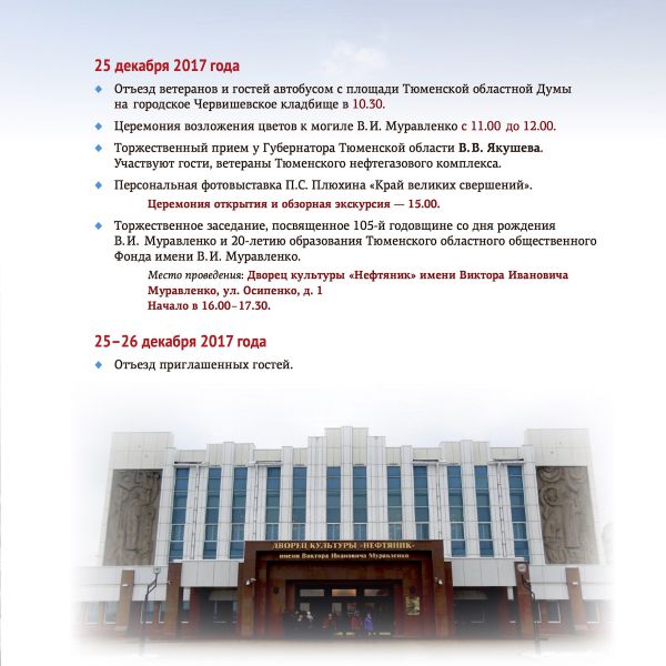 25 декабря 2017г. исполнится 20 лет с тех пор, как был образован Тюменский областной общественный Фонд имени В.И.Муравленко, и 105 лет со дня рождения Виктора Ивановича Муравленко – первого начальника Главтюменнефтегаза, Героя Социалистического Труда, Лауреата Ленинской и Государственной премий, премии Совета Министров СССР, депутата Верховного Совета СССР. Под его руководством трудились многие члены нашего землячества – первопроходцы освоения Западной Сибири.