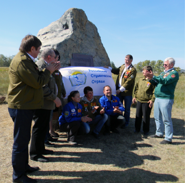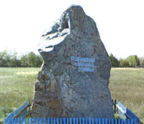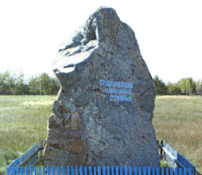 Пять лет назад комиссар Российских студенческих отрядов Лейла Расулова разыскала камень в совхозе «Золотая нива», на котором раньше была установлена памятная табличка в форме целинного значка с надписью «Студенческая целинная стройка 1959». К сожалению, в 1990-е годы вандалы уничтожили её, скорее всего сдав в металлолом. На месте похищенного знака кто-то синей краской сделал надпись: «Студенческая целинная стройка».