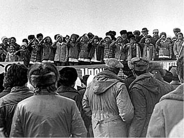 Пионеры на митинге по поводу прибытия первого поезда на станцию Ноябрьская.