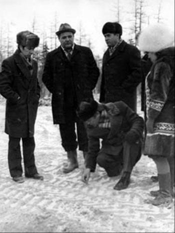 Когда стало известно, что СМП, которому определено строить железную дорогу на участке до Тарко-Сале, начал готовиться к перебазированию в пункт будущей первой станции на границе Ямало-Ненецкого и Ханты-Мансийского автономных округов, мы с Председателем Пуровского райисполкома Г.Г.Кулиничем на вертолете вылетели туда. Высадились возле людей, которые работали на просеке для ЛЭП-500 Сургут-Уренгой. Они нам объяснили, что это территория Сургутского района, а десант строителей железной дороги, как они предполагают, должен находиться севернее. Мы полетели дальше и увидели вагончик, рядом с ним только построенную вертолетную площадку из бревен. Когда вертолет делал круг, из вагона вышел человек и стал махать руками, призывая приземлиться. Это был представитель Строительно-монтажного поезда, который сообщил, что именно здесь будет станция. Было очень грязно. До вагончика в туфлях было невозможно пройти. Этот человек принес нам сапоги. В вагончике он раскрыл карту и показал, где мы находимся. Он сказал, что Строительно-монтажный поезд-329 активно начнет перебазироваться на данное место, в первую очередь, будет доставлять технику, вагончики, сборные общежития и котельную. И на память подарил сапоги, в которые мы обулись.
